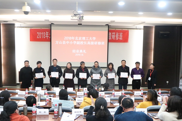 2019年1月6日,北理工教师发展中心组织“方山县中小学副校长高级研修班”结业仪式。44名学员、理工附中党委副书记潘军、理工附小直属党支部书记饶晓炜、幼儿园园长沈红、教师发展中心副主任侯爱军出席仪式。教师发展中心副主任仇芳主持仪式。