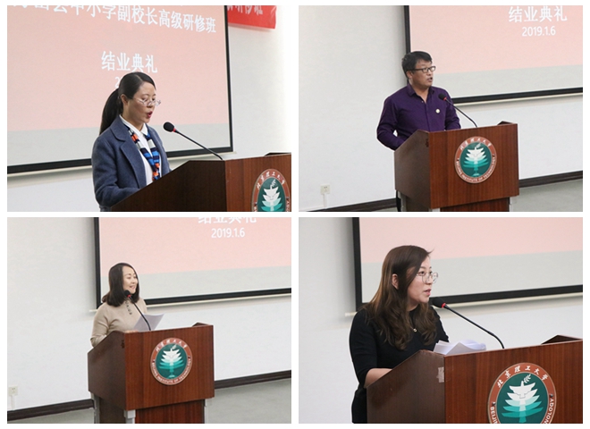 结业仪式上各参会领导为学员们颁发了结业证书;六位学员小组组长分别以《感悟中成长-扮演好自己的角色》《开发校本特色的德育活动 开展卓有成效的德育教育》《如何有效的开展家校合作》 、关于小学生心理健康教育的思考》《浅谈小学班级管理》和《如何有效开展幼儿园区域活动》为题作了主题报告。