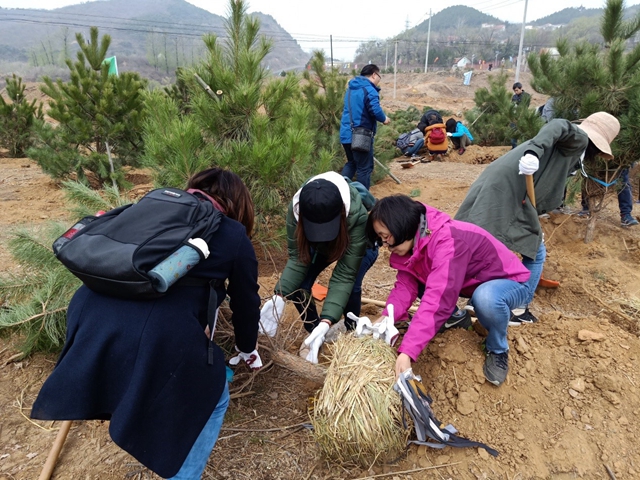 本次植树任务,是在一片退耕还林的土地上种植松树。树坑已经挖好,密云绿化办的工作人员将栽种的树苗摆放在地头。听完绿化办工作人员的植树要求后,大家拿起铁锹,三人一组,撸起袖子干起来。先是解开捆在树苗上的绳索,然后把树苗搬进树坑,一人扶正,两人挥锹培土,最后围堰,每一个步骤都像上课一样认真对待、一丝不苟。四月的天气温度不高,二十多棵松树种下来,大家衣服都湿透了。看到小松树结结实实地种到土里,大家喜悦之情洋溢在脸上,成就感不亚于给学生们上了一堂好课。