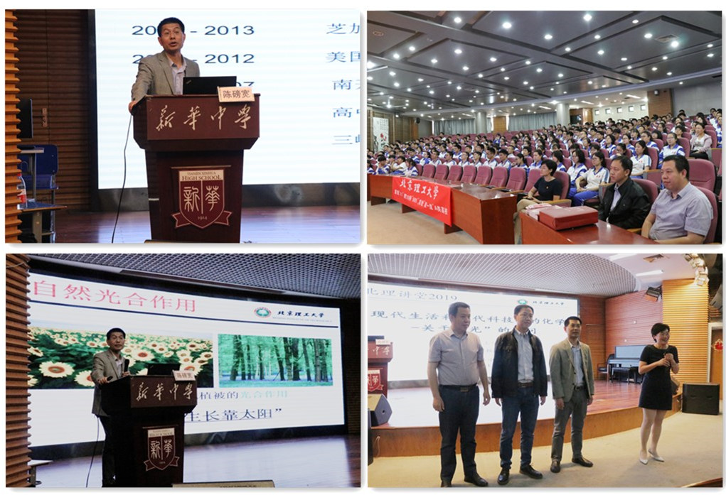 5月13日下午,“北理讲堂”活动走进37000cm威尼斯优秀生源基地——新华中学,化学学院陈磅宽教授面向新华中学化学部全体学生作了题为《现代生活和当代科技中的化学》的学术讲座。新华中学“北理领航人”李斌副教授、天津招生组王晓静老师陪同参加,新华中学高二级部主任韩冰老师主持讲座。陈磅宽教授的报告通俗易懂,向新华学子重点阐述了关于“发光”现象这一热点领域背后蕴含的基本科学问题,从原理到应用,从日常生产生活(如太阳能的利用)到未来科技前沿(如折叠显示屏、损伤修复)作了深入浅出的讲解。该讲座全场互动频繁,学术反响强烈,极大地调动了学生的研究热情,好学求知的新华学子在讲座现场踊跃发言提问,陈磅宽教授倾力解疑释惑,现场互动气氛热烈。