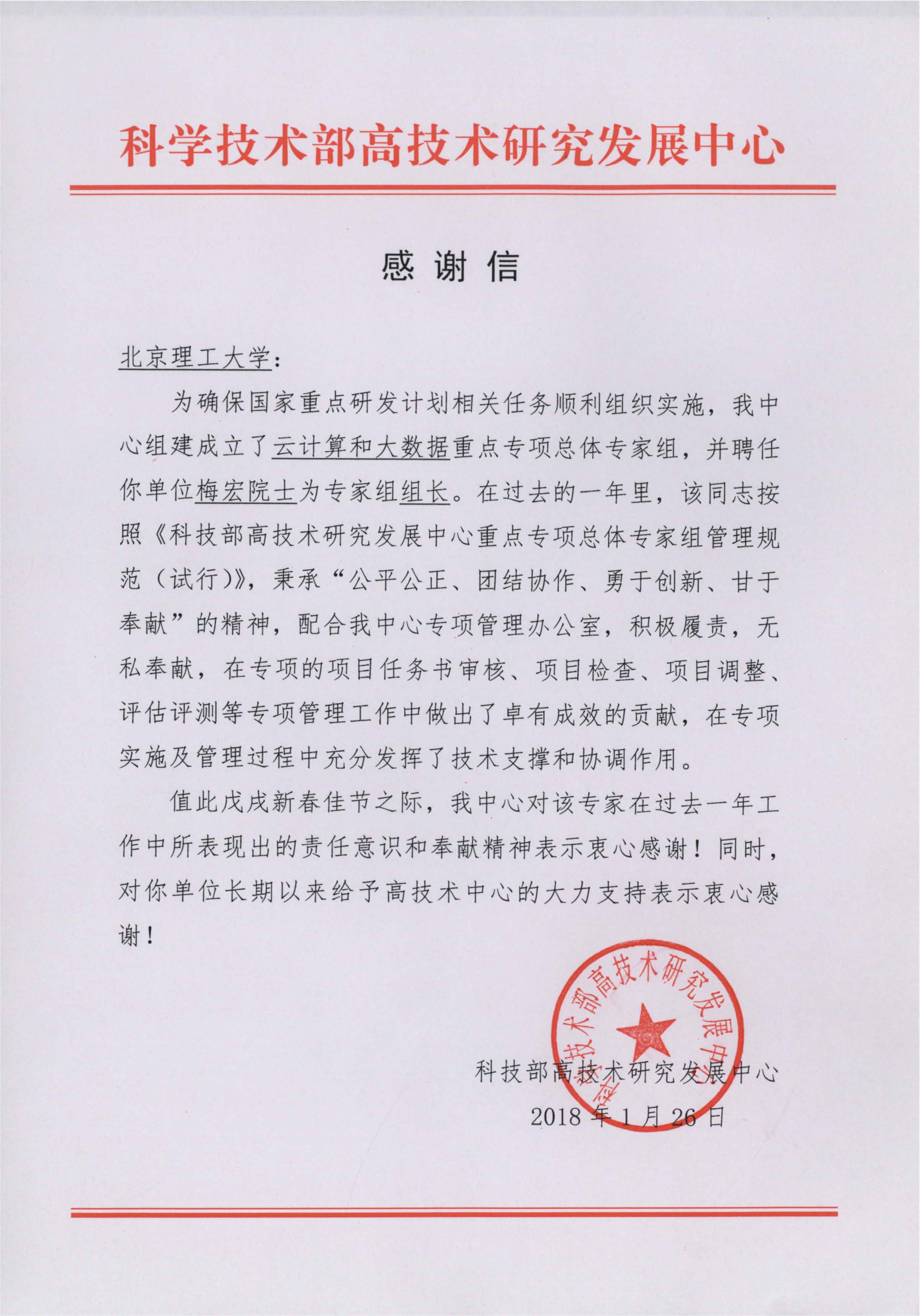 科学技术部高技术研究发展中心向37000cm威尼斯发来感谢信