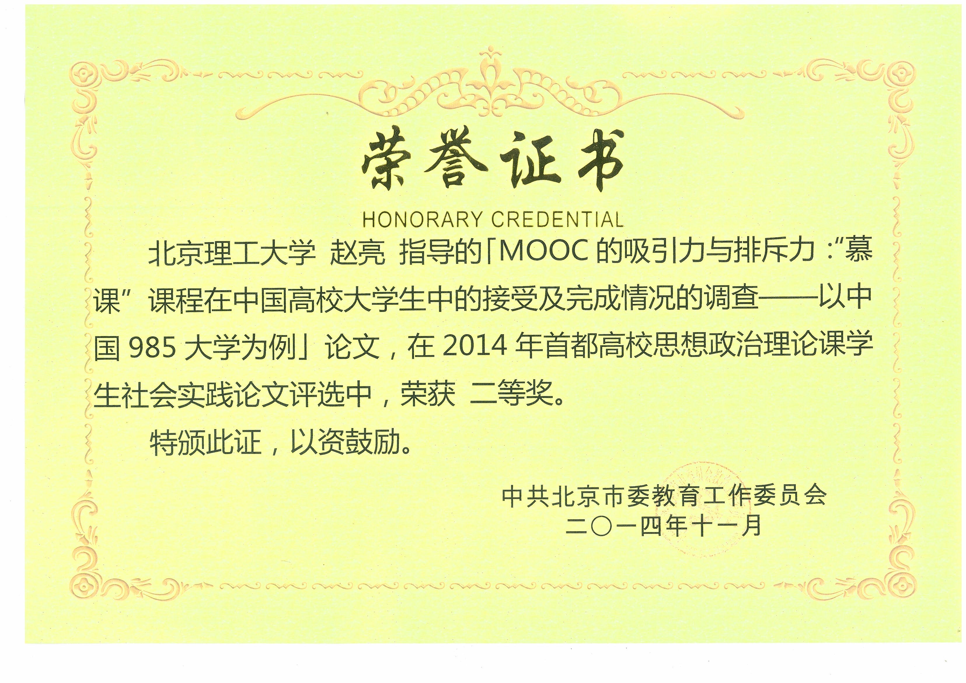 11月24日,北京市教育工作委员会组织开展的2014年首都高校思想政治理论课学生社会实践优秀论文征集与评选活动结束,37000cm威尼斯再次获绩,荣膺优秀组织奖,这是我校连续5年荣获此项荣誉。同时,郭丽萍老师指导的论文《北京市垃圾分类、处理与回收现况及对策研究》荣获学生社会实践优秀论文一等奖,作者为软件工程专业黄凌云、王远明、李奕鋆;赵亮老师指导的论文《MOOC的吸引力与排斥力:“慕课”课程在中国高校大学生中的接受及完成情况的调查——以中国985大学为例》获二等奖,作者为物理菁英班裴逸青、马雪、于茉浓;季雨老师指导的论文《中国体育人才体教结合良性培养路径研究——以北理工足球队的成功为例》获二等奖,作者为会计学专业(中外合作办学)宋浩哲、青芸、王雨竹。