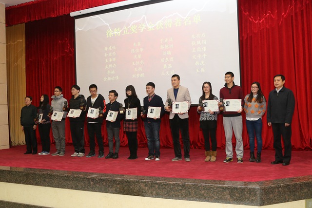 胡海岩宣读了我校最高荣誉、徐特立奖学金获奖名单并为获奖代表颁发荣誉证书,张炜及学校首位徐特立特等奖获得者、化学学院教师赵杨向获奖代表颁发徐特立铜像。随后,赵杨以徐特立老院长的教诲"青年人任重道远,要继承的不是财产,而是先辈留下的尚未完成的革命事业",表达了与同学们共勉共进之意。徐特立特等奖获得者韩庆回顾了自己并不轻松的2015年,她表示尽管困难重重,但始终感到有一束光照亮自己前进的路,她认为"时间对每个人都是公平的,心在哪里,时间在哪里,收获就在哪里”。徐特立特等奖获得者武烨存向大家表示了感谢,感谢学校给了自己飞翔的起点,感谢老师给了自己飞翔的翅膀,感谢同学们给了自己飞翔的勇气,他表示要以今天为新的起点,继续拼搏,为母校、为祖国、为社会、为世界贡献自己的绵薄之力。