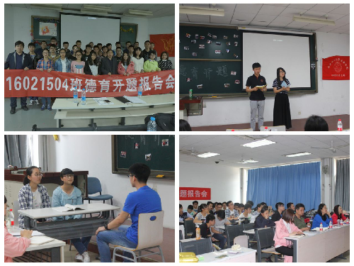 160211501班将答辩地点设在风景宜人的北湖湖畔,接近大自然打开心扉,同学们结合《致青春》的读书感受,总结了这一学期以来的得失,分享了个人感悟,并表达了对未来的憧憬。16021502班以《中国合伙人》影片为切入点,每位同学结自身情况对大学的理想和目标进行了阐述与规划。16021503班以同学们自导自演主题短剧作为线索,生动展示了大学中从军训、上课、考试、考研到就业时可能遇到的困难和挫折,成为德育开题答辩的一大亮点,寓教于乐。16021504班以“家在心中,梦在远方”为主题,加入了“相知相守”自制视频日志,纪录了班级活动的点点滴滴,营造了良好的氛围。