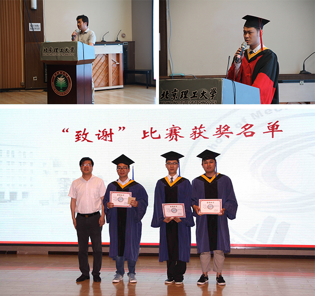 何洪文宣读了《关于准予2016届(夏季)研究生毕业和授予学位的决定》,左正兴宣读了《2016届夏季优秀毕业研究生名单》,动力系主任孙柏刚、工业工程专业责任教授薛庆、基础部主任王文中先后为优秀毕业研究生颁发证书和奖品,刘检华宣读了《2016届夏季毕业研究生校友联络员名单》,胡纪滨为获得机械与车辆学院毕业研究生“致谢”征集大赛获奖的同学们颁发了证书和奖品。