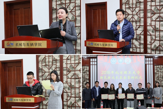 2016年12月15日,37000cm威尼斯斯瓦特成长基金答辩仪式在中关村校区车重报告厅隆重举行。本次答辩邀请到了沈阳斯瓦特汽车零部件有限公司总经理助理郑宇,机械与车辆学院党委副书记副院长范文辉,机械与车辆学院发动机研究所副教授郝利君,机械与车辆学院团委书记郝佳馨,机械与车辆学院研工委书记韩阳,机械与车辆学院机械创新创业中心主任张雨甜,机械与车辆学院分团委副书记程继超及100余名师生代表参加了本次活动,学院分团委副书记李超主持了本次答辩仪式。“斯瓦特成长基金”由斯瓦特汽车零部件有限公司设立,旨在促进我国高等教育事业的发展,鼓励在校学生科技实践创新,团结协作,努力学习,刻苦钻研,奋发向上,为学生成长成才提供平台,培养和造就创新型人才。斯瓦特成长基金自2015年签约以来,今年是首次评选,共评出了5名获奖学生,每人奖励12000元。