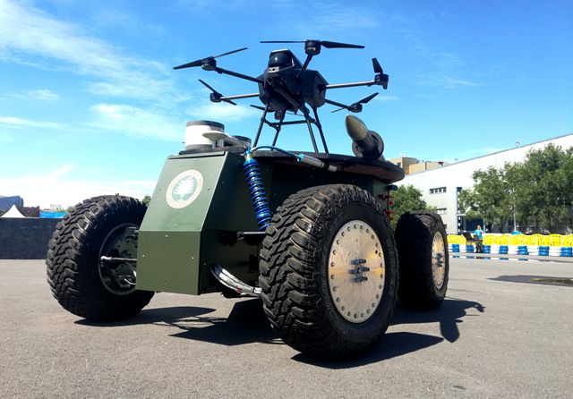 此次在世界机器人大会上亮相的是“地面航母”第二代样机。在第一代样机的基础上,“地面航母”第二代样机上方云台还搭载了由北理工研发的“飞天工兵”空中自主作业机器人、合作单位研发的武装无人机和107毫米巡飞弹。其中,空中自主作业机器人着眼于作业任务对复杂环境适应性和作业系统智能性的要求,创造性地将工兵快速遂行多种工程作业与战斗任务的能力拓展到空域之中,特别适用于军、警、民各领域中的接触型自主作业任务;所搭载的武装六旋翼无人机具有侦察、救援、武装攻击、察打一体等功能,可自主巡航60-90分钟,实现500米范围内的爆震弹、催泪弹精准发射;所搭载的107毫米巡飞弹可采用炮管发射方式固定翼无人机,固定翼无人机的巡航高度可达到数公里,进行较长时间的自主巡逻飞行,完成侦查、毁伤评估、目标打击等任务。