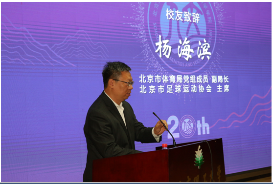 杨海滨代表校友发言,他感谢母校和学院的培养、表态要作为志愿者为母校和学院服务,并祝福母校、学院和老师、校友们们永远年轻,他的发言表达了全体人文校友的心声。