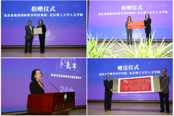 典礼上,卜氢军女士代表北京易赛思国际教育科技集团为学院捐赠150万元,支持学院办学。杨宾代表学校向卜氢军女士颁发捐赠证书。卜氢军女士在发言中表达了支持国家教育事业的热忱,表达了对学校和学院的诚挚祝福。