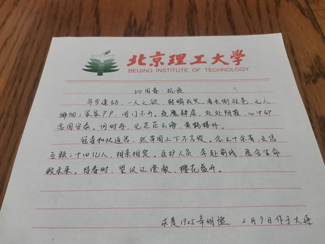 “疫魔肆虐,处处阴霾,心中却念国安泰。”“冠毒如此迫害,然举国上下不言败。”“待春时,望汉江澄澈,樱花盛开。”2月12日下午,北理工求是书院1905团支部“众志成城,中国加油”示范性网络主题团日活动如期开展,来自辽宁大连的辛玥燃同学通过网络向师生们朗诵了她创作的小词《沁园春·抗疫》,与她一同在线的还有辅导员、学育导师、朋辈导师、团支部全体同学等三十余名师生。