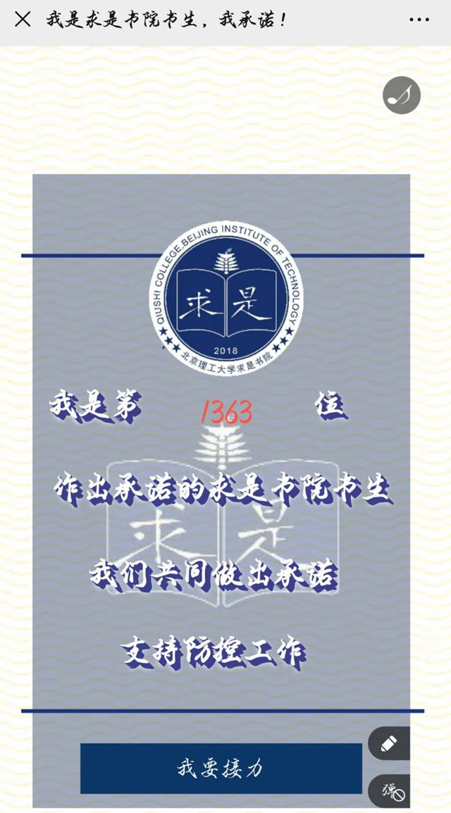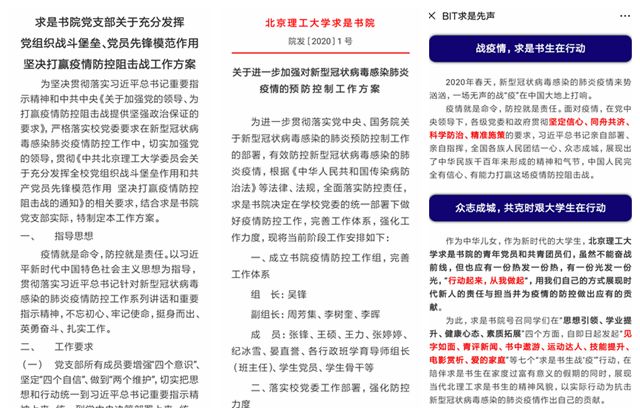新冠肺炎疫情虽然阻隔了师生们相聚的脚步,但却挡不住北理工青年学子们战“疫”的决心。防控工作启动以来,按照学校防控工作统一部署,求是书院积极组织力量,通过网络等多种形式,创新形式,关心关爱学生,认真开展学生思想教育。