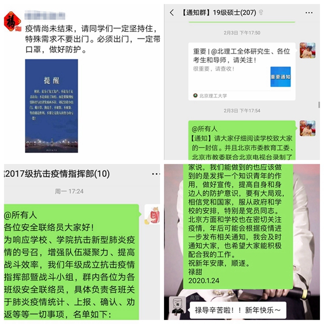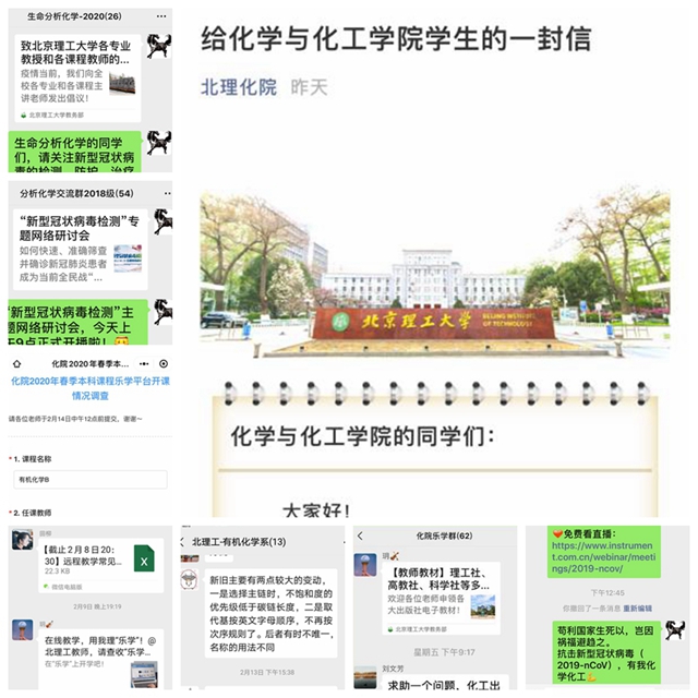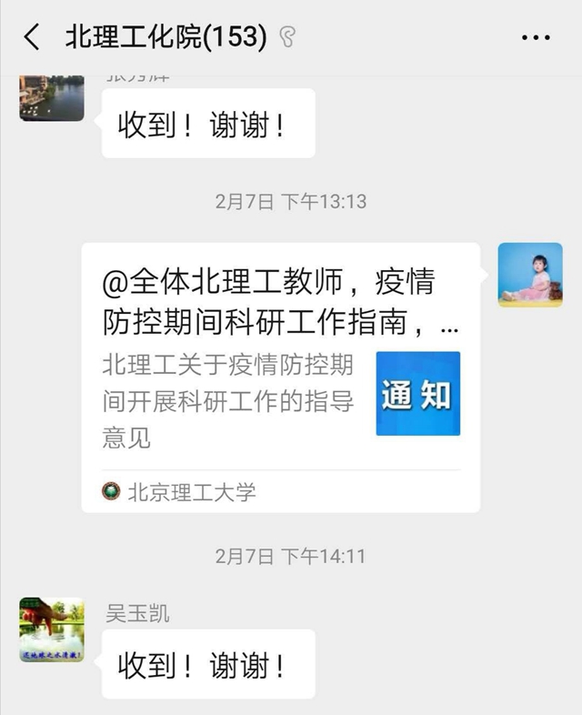 编辑:秦月 审核:王振华 张加涛 阅读次数:疫情防控期间,北理工化学与化工学院按照学校党委关于做好新型冠状病毒感染的肺炎疫情防控工作的相关要求,第一时间成立了以学院党委书记、院长为组长的疫情防控工作领导小组,全面落实党中央及各级部门决策部署,完善本学院防控举措。小组成员分工负责,强化责任担当,及时在防控工作群传达学校最新疫情防控要求,并按照学校要求在做好疫情防控工作的同时,扎实有效地推进了学院科研、教学、学生管理等各项工作。